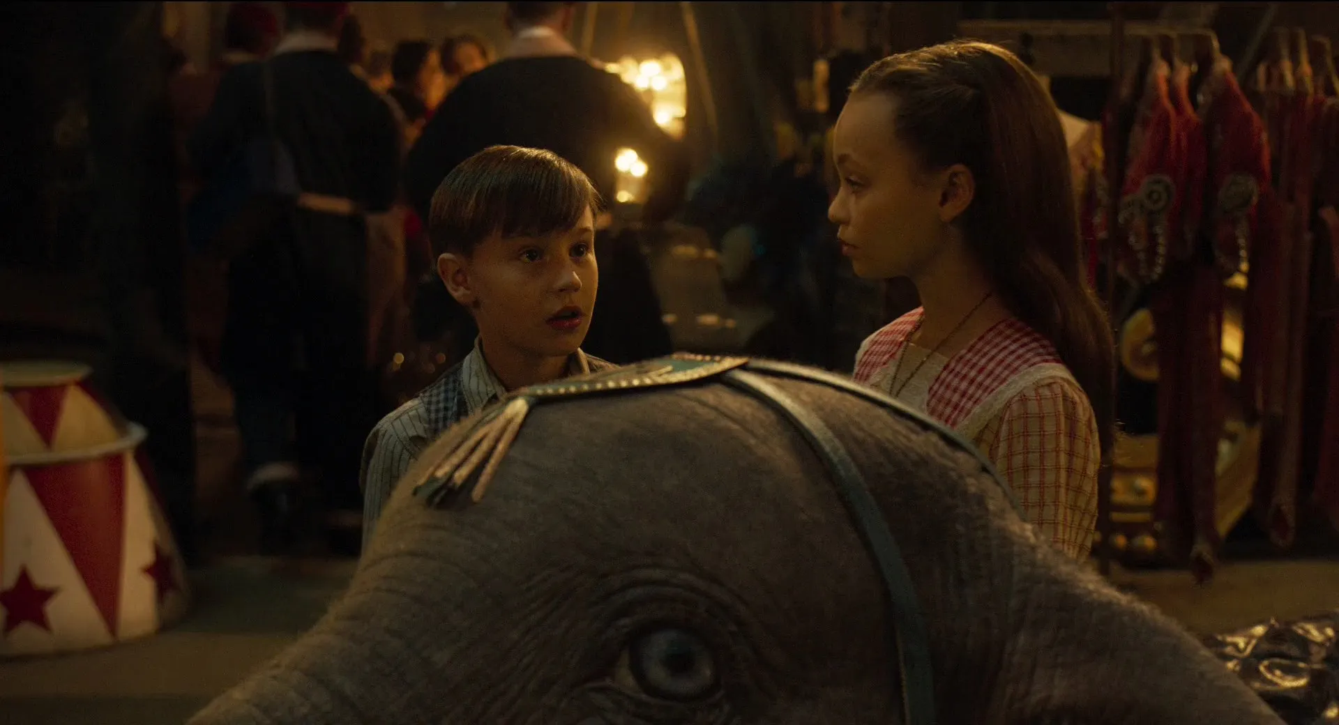 Actors: Colin Farrell as Holt Farrier, Michael Keaton as V. A. Vandemere, Danny DeVito as Max Medici, Eva Green as Colette Marchant, Alan Arkin as J. Griffin Remington, Nico Parker as Milly Farrier, Finley Hobbins as Joe Farrier, Roshan Seth as Pramesh Singh, Deobia Oparei as Rongo the Strongo, Joseph Gatt as Neils Skellig, Miguel Muñoz Segura as Ivan the Wonderful, Sharon Rooney as Miss Atlantis, Zenaida Alcalde as Catherine the Greater, Michael Buffer as Baritone Bates, Phil Zimmerman as Rufus Sorghum, Ragevan Vasan as Pritam Singh, Frank Bourke as Puck the Organ Grinder, Zelda Rosset Colon as Anne Farrier, Benjamin French as Contortionist, Jana Posna as Poodle Trainer, Jo Osmond as Cook, Jewels Good as Mademoiselle Flambé, Lars Eidinger as Hans Brugelbecker, Tom Seekings as Teenager in Crowd, Douglas Reith as Sotheby, Sandy Martin as Verna the Secretary, Heather Rome as Stuffy Society Woman, Scott Haney as Rancher, Erick Hayden as Rancher, Greg Canestrari as Heckler, Chris Rogers as Heckler, Max Gill as Mean Teen, Peter Brookes as Mean Teen, Simon Connolly as Stage Manager, Nick Bartlett as Armored Truck Driver, Harry Taylor as Power Tower Guard, Vincent Andriano as Bridge Guard, Liam Bewley as Nightmare Island Guard, Ben Crowe as Dreamland Guard, Josef Davies as Dreamland Security Guard, Clive Brunt as Burly Engineer, Richard Leeming as Pipsqueak Engineer, Angela Ashton as First Maid, Alice Bonifacio as Second Maid, Philip Rosch as Reporter, Joseph Macnab as Reporters, Rob Heanley as Reporter, Amerjit Deu as Indian Ship Captain, Lucy DeVito as Coat Check Girl, Richard James-Clarke as Joplin Man, Matthew Castle as Joplin Man, Bret Jones as Joplin Man, Zee Asha as Joplin Woman, Carol Been as Joplin Woman, Jessica Barker-Wren as Joplin Woman, Arabella Neale as Woman, Rosie Akerman as Woman, Tim Southgate as Vendor, Anatoli Akerman as Clown, Kamil Lemieszewski as Circus Attendant (uncredited), Zoë Scott as Lavish Apartment Maid (uncredited), Suan-Li Ong as Fringe Girl Dancer (uncredited), Bern Collaço as Joplin Audience Member, Paul Riddell as Circus Goer (uncredited), Will Rowlands as Mr. Wilcox Customer